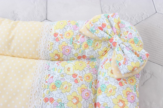 クリームイエローのドット生地を組み合わせて、生成りの綿レースで飾り付け。